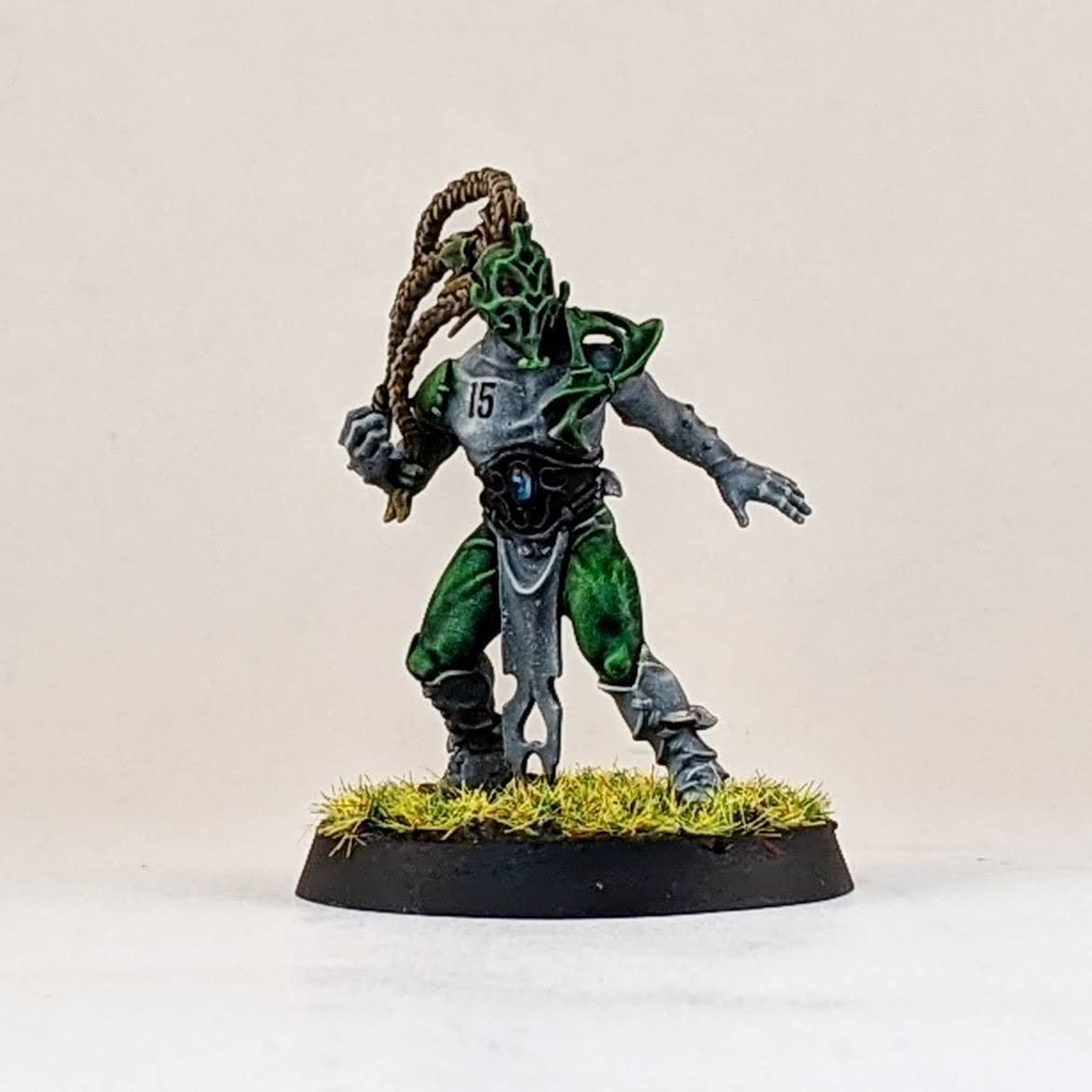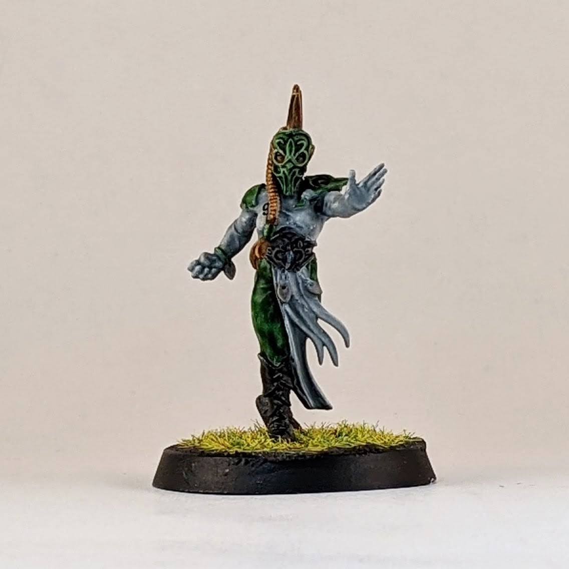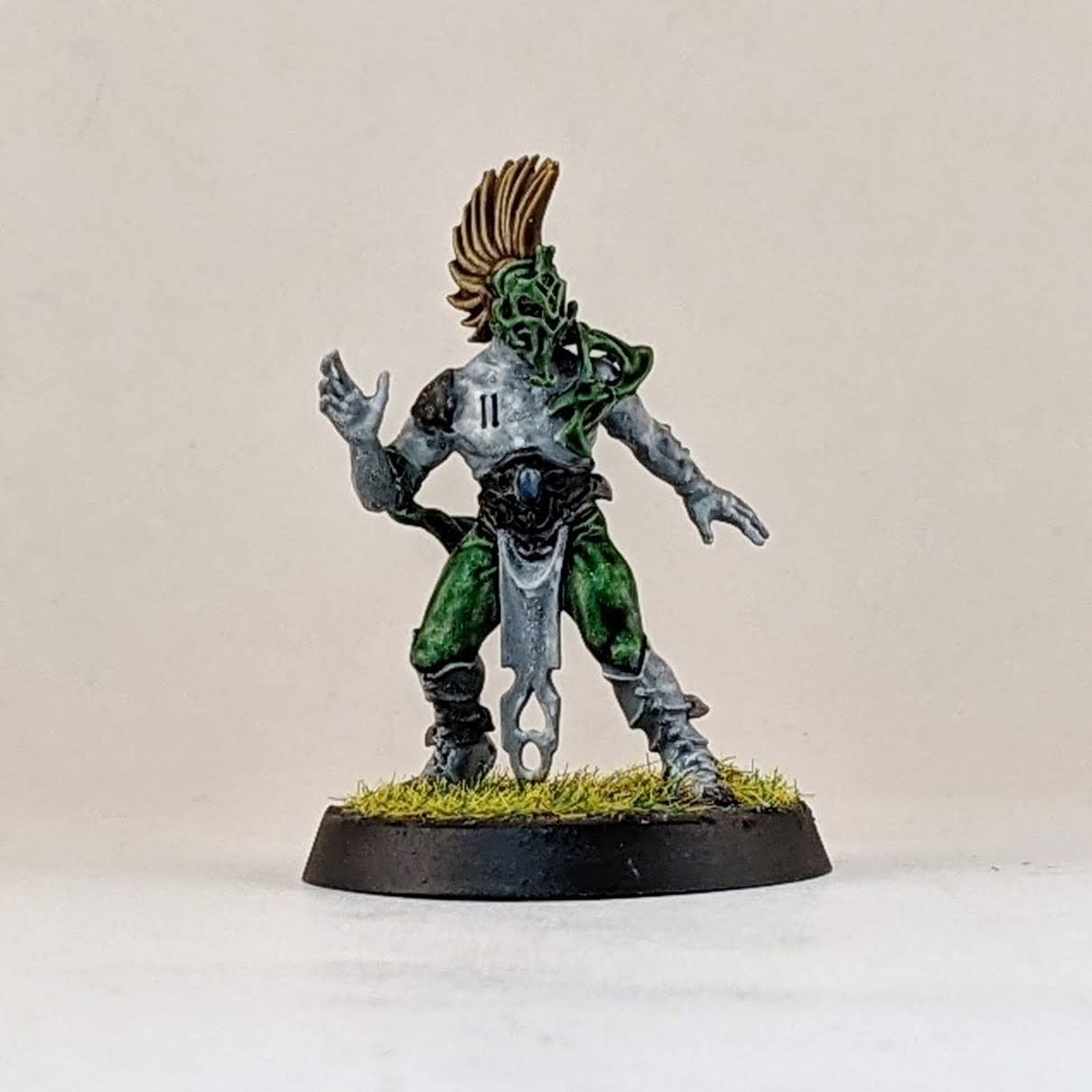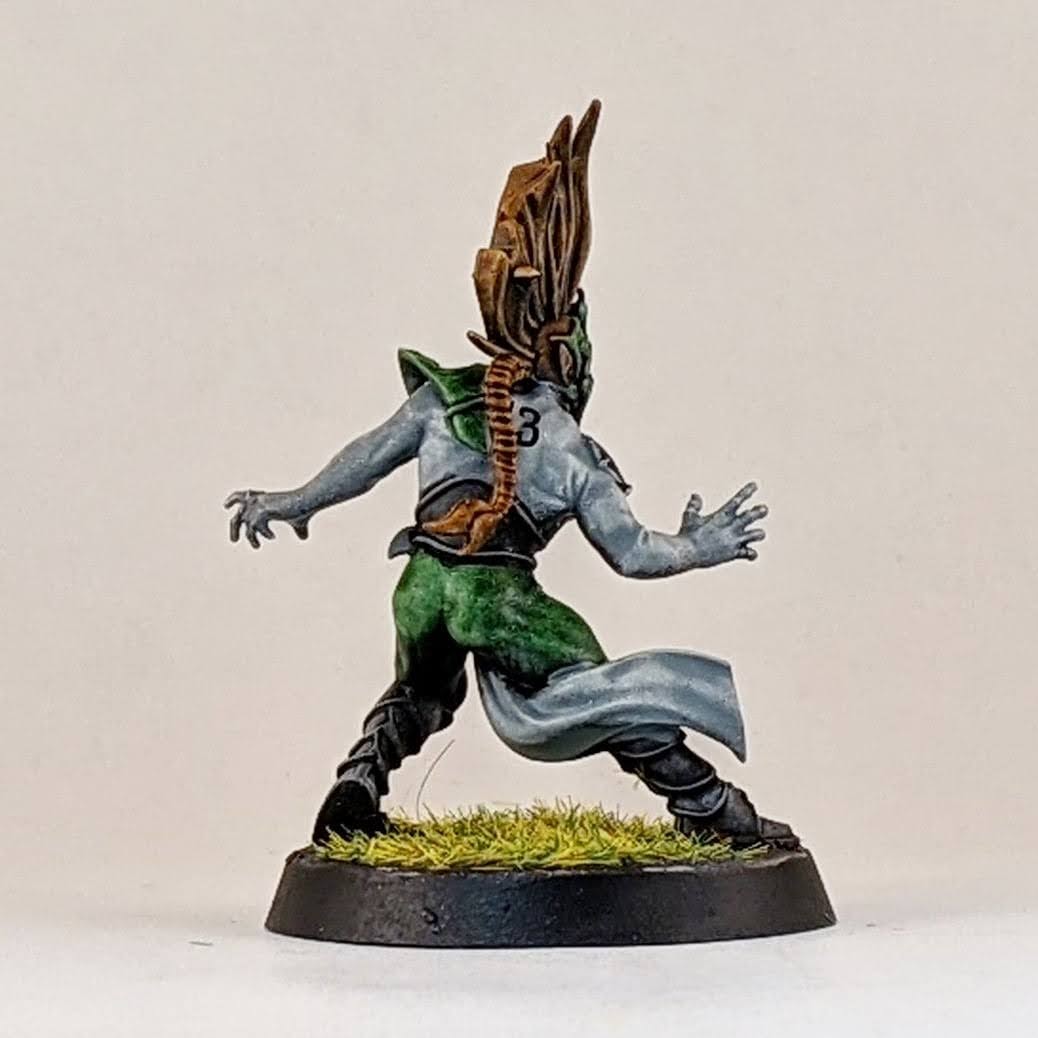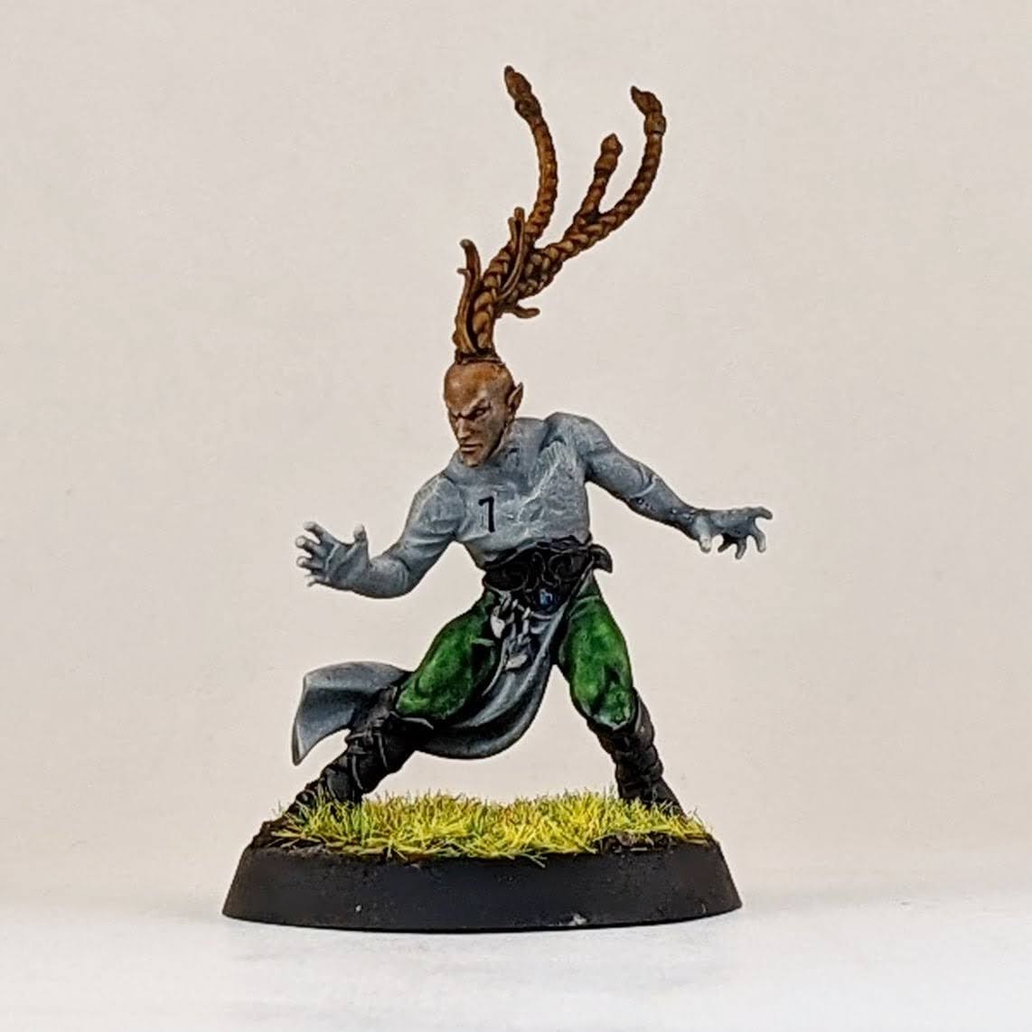 I’m not sure I’ll ever take four catchers on a wood elf roster, but I figured I may as well have the option. I decided to split a box of Athelorn Avengers with Mr. White giving me one catcher and options to convert a lineman into a catcher. The key difference between the catchers and linemen are their lack of shoulder pads, big belt buckle and their gloves. I selected the lineman body with the most catching pose and shaved off his little under shoulder pads and the connection points for the big shoulder pad. The belt buckle isn’t the same and he doesn’t have the gloves, but I hope it’s enough to distinguish him from the similarly posed linemen. It probably won’t ever be an issue as I stated above, using all four catchers at once is highly unlikely for me. I also used one of the catcher heads on the lineman body to help him stand out. And for the standard catcher pose, to avoid duplicate models with the other catchers, I used a spare wardancer head.