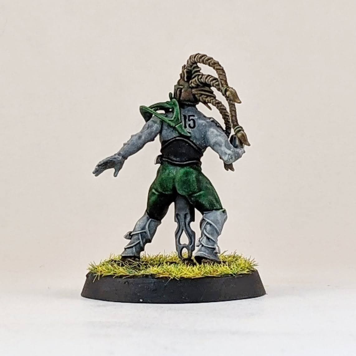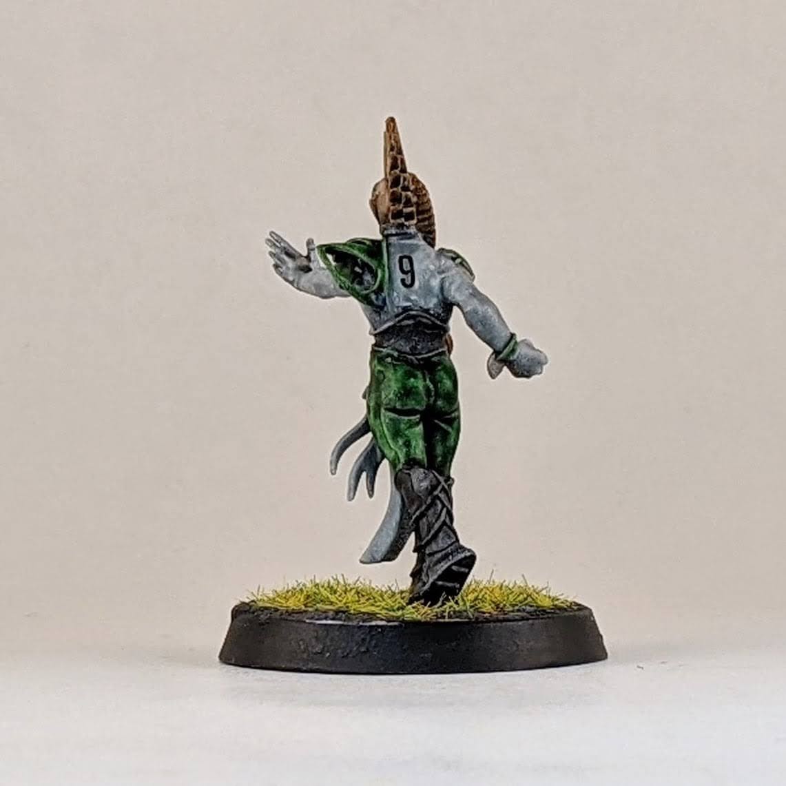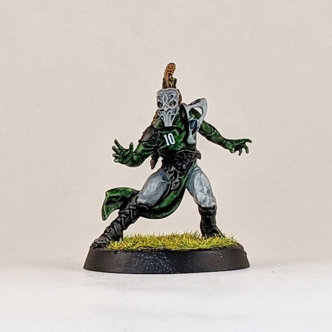 I also added two more linemen. A lot of suggested starting wood elf rosters include 8 linemen, so it’s very likely these two will see action in league play. Or at the very least, it doesn’t hurt to have extra linemen to use as journeymen when players get injured. Pretty standard here except I used different heads than go on these bodies as suggested in the instructions. The female linemen has the head of a thrower, but her face got cut away and I used one of the masked female faces. Subtle, but another original model.