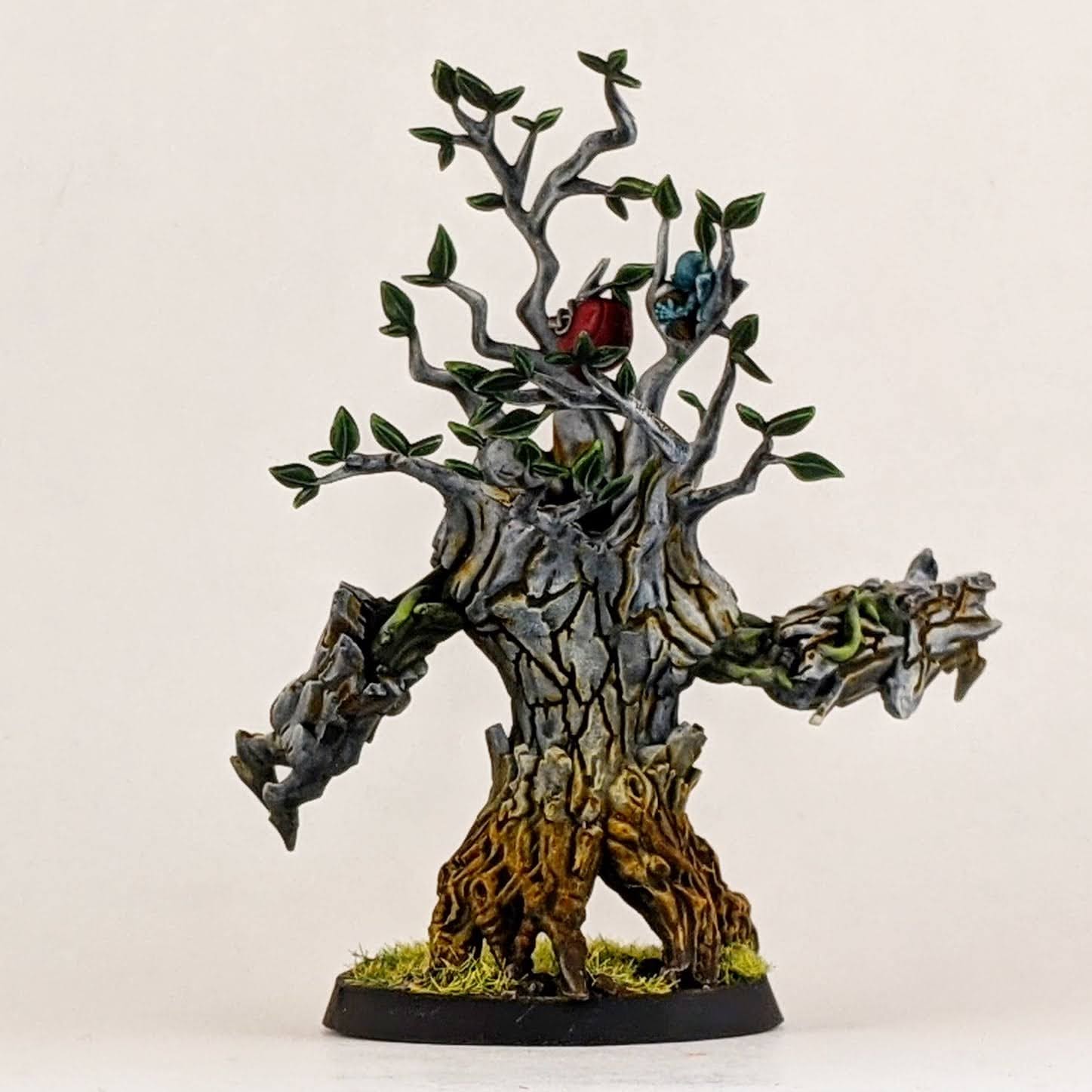 After finishing the initial 12 players, I always meant to go back and round out the roaster with some more players and I knew some day GW would release a treeman but it took more than a year for it to come out. It was the treeman’s release that got me motivated to finish the team. I decided to paint up my treeman in a similar style to my Warhammer Underworlds sylvaneth warband (which is another covid-19 project i completed in 2020 that I don’t think I’ve blogged about yet … I’ll have to rectify that). That is to say a white aspen tree, but instead of fall colors like my sylvaneth warband, to do regular spring/summer green leaves, in this way it would fit in with the white and green colors of my wood elf team but with a more natural look. Originally I had intended to use the wood elfy helmet on the treeman, but when I got Blitz Bowl 2 and a halfling bzb team for my birthday I decided to leave the mask off. That way I can use the humans, dwarves and halflings I acquired for Blitz Bowl and turn them into an Old World Alliance team for Blood Bowl. You can get a hint of what my color scheme will be for my future Old World Alliance team by checking out the helmet stuck in the treeman’s branches.