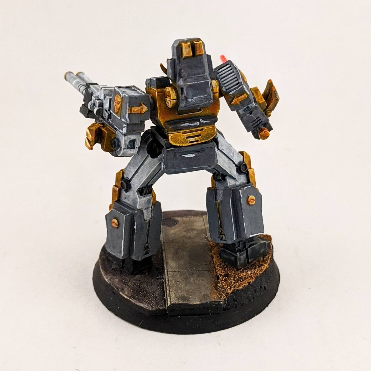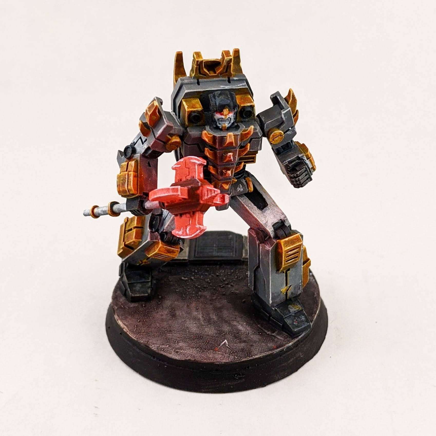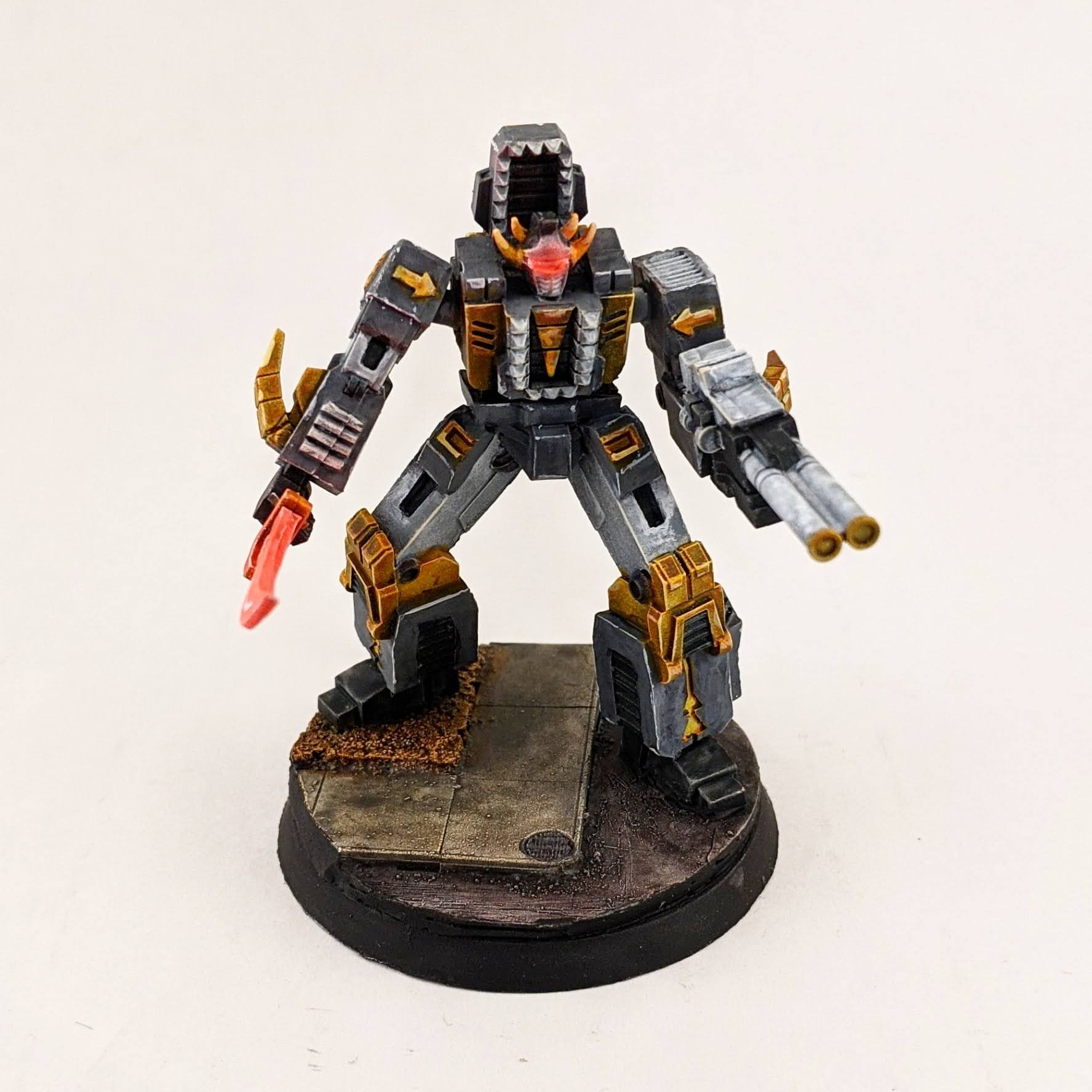 Bot War is a skirmish game at 10mm scale, which is a bit of an oddity. 10mm is a scale where you expect to see massive battles take place on a small scale, but when you’ve got giant robots on each side you don’t need quite so many models. Some of the factions do indeed feature troops and vehicles at this scale and some are just robots and some are a mix of both. I have a preference for elite factions in games because it means buying and painting fewer models. This, combined with my love of dinosaurs and Transformers as a kid steered me to the dinosaur robots the Beastlords! There are seven models in total for this faction, but I started off with just these three to get a taste for the game.