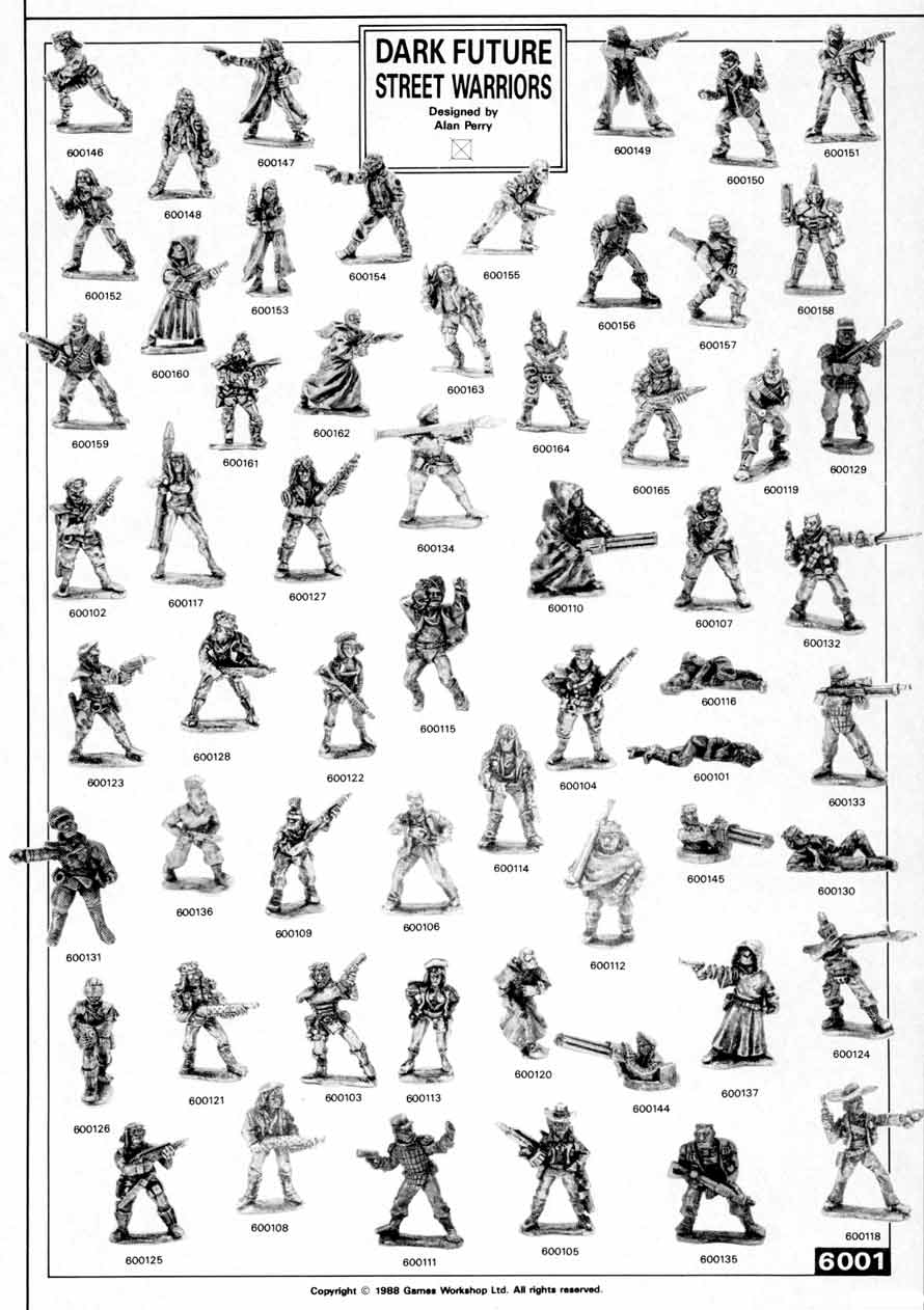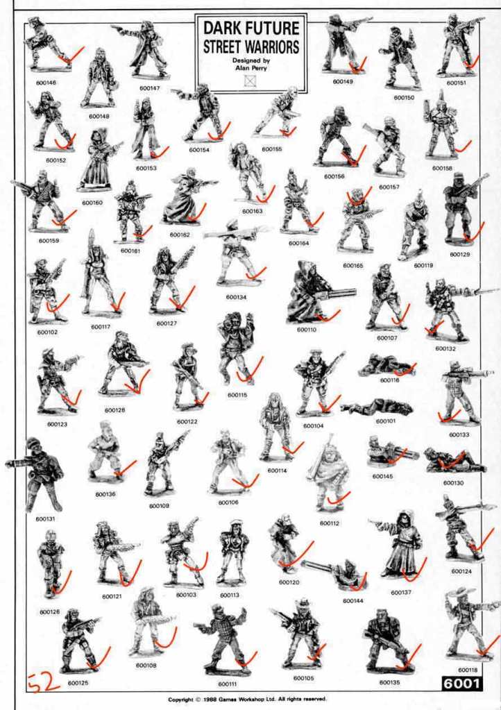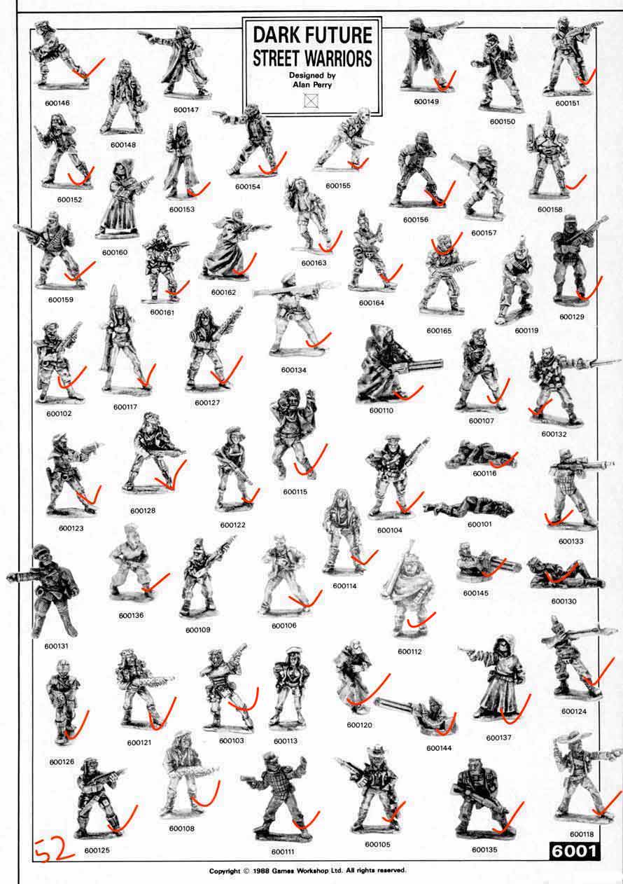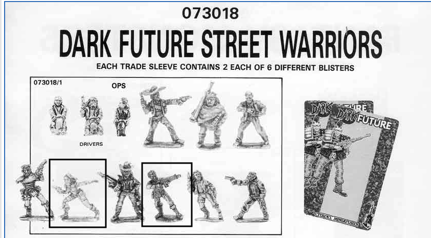 Near as I can tell from crawling the world wide web, the above image is pretty much a master list of all the available 20mm Citadel Street Warriors for Dark Future. To be clear, this is bodies on their feet. There are several drivers and such not included above. Also, the above is complete besides three others: a special edition Santa that pops up on eBay pretty frequently, and the two ‘Ops’ I’ve framed in the below image.