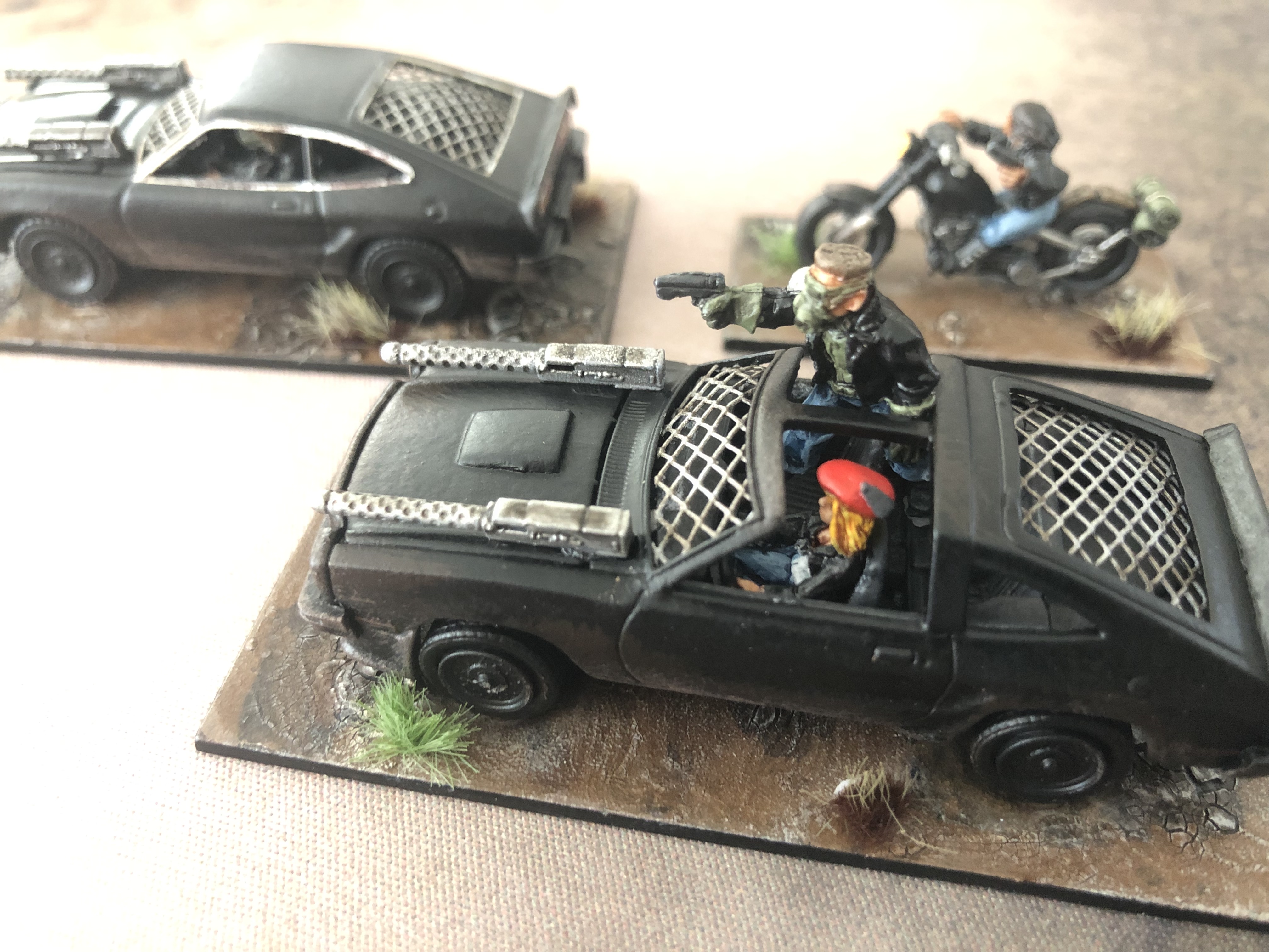 I went with the Black Bandit versions of the cars because I wanted the vibe of the muscle cars to have that same sort of leather jacket, rock’n’roll look. It’s a little frustrating that the driver of the closed top can hardly be seen at all. This is the curse of including drivers though. Sometimes, they just aren’t seen. The dude is another long haired, leather jacketed, jeans wearing road warrior from the Citadel driver range.