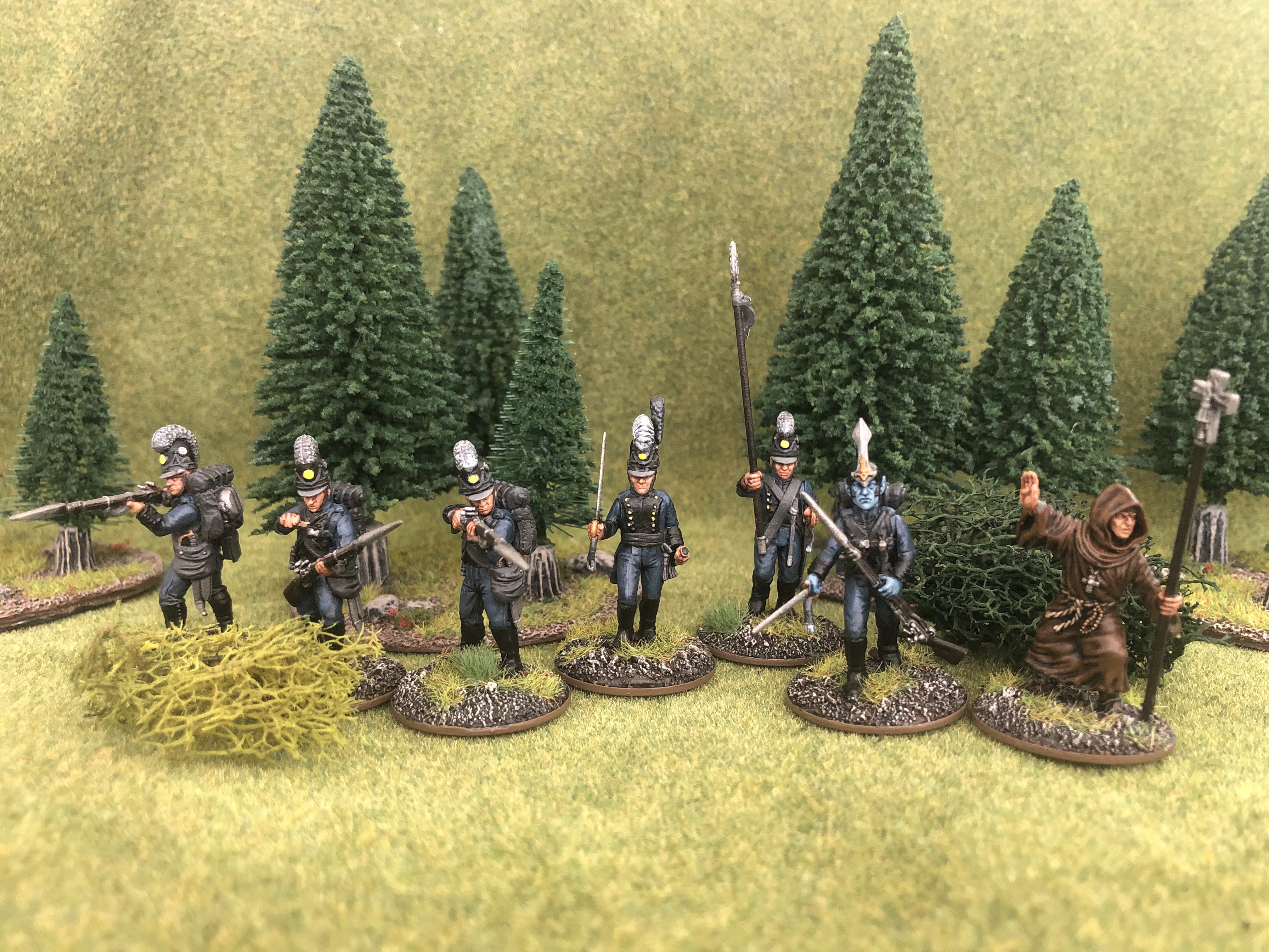 The dhamphir’s blue skin helps him stand out in the unit and I appreciate how the model using a musket as a one-handed weapon implies a supernatural strength. The monk, I was thinking I might actually do in dark blue robes to match the others, but opted to stick with traditional browns so the unit retains a historical feel and doesn’t dip too far into fantasy.