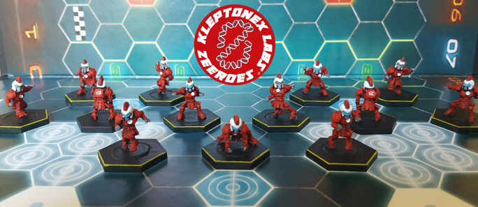 Pretty much all red with a little white trim and one piece of light blue pop and that’s it. I went white on all the little metal teeth looking bits, and as these models don’t have cool sci-fi visors, the blue is the front part of the helmets on the Blockers. I sourced extra sprues so I could have five Blockers all in uniform helmets and the one lone Runt Punter stands out with his pose and lack of bucket on his head.