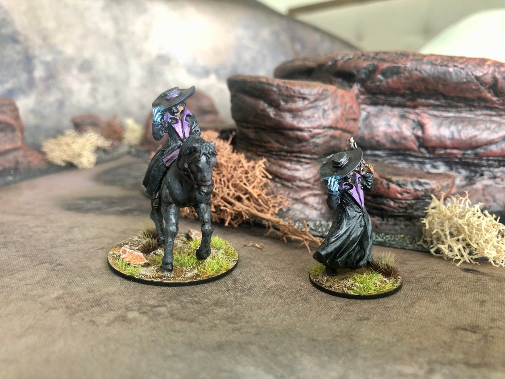 Like the Female Outlaw leader in the previous post, I picked up the Necromancer in mounted and unmounted versions. He’s the “Outlaw Leader” on the Black Scorpion site, but I thought his hidden face behind the long-brimmed hat gave him the shadow of mystery for the dark arts vibe. His right hand is my attempt to show his controlling of the Revenants. Using the Dark Confederacy rules, again, the theme here is undead outlaws not “south will rise again” Confederates.
