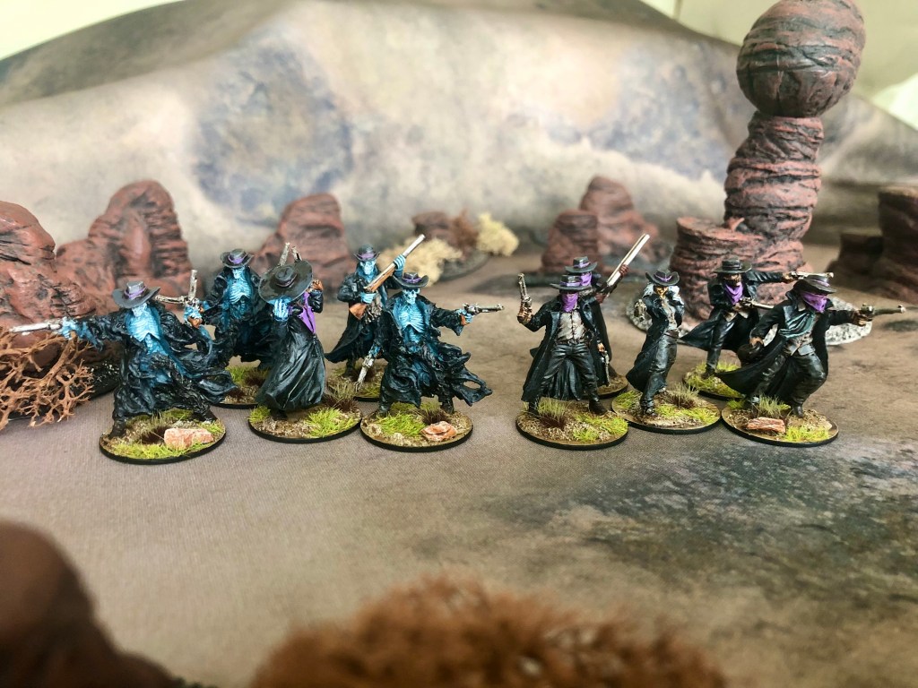 Here’s the full, ten member posse. Necromancer and his Revenants on the left, second-in-command and the living outlaws on the right. There’s a heel faction in the WWE called “Judgement Day” that sports black and purple. I hadn’t considered that when I picked out the color scheme for this posse, but Judgement Day has a nice ring to it for an undead posse.
