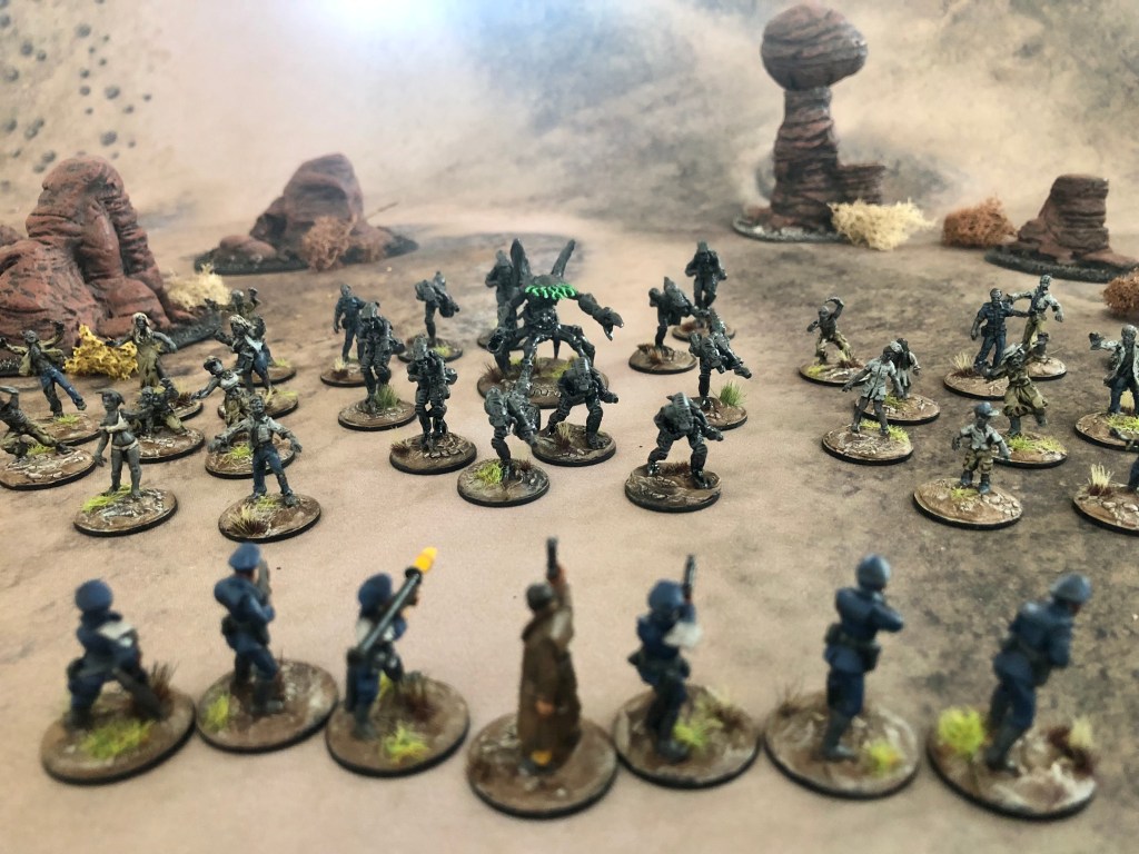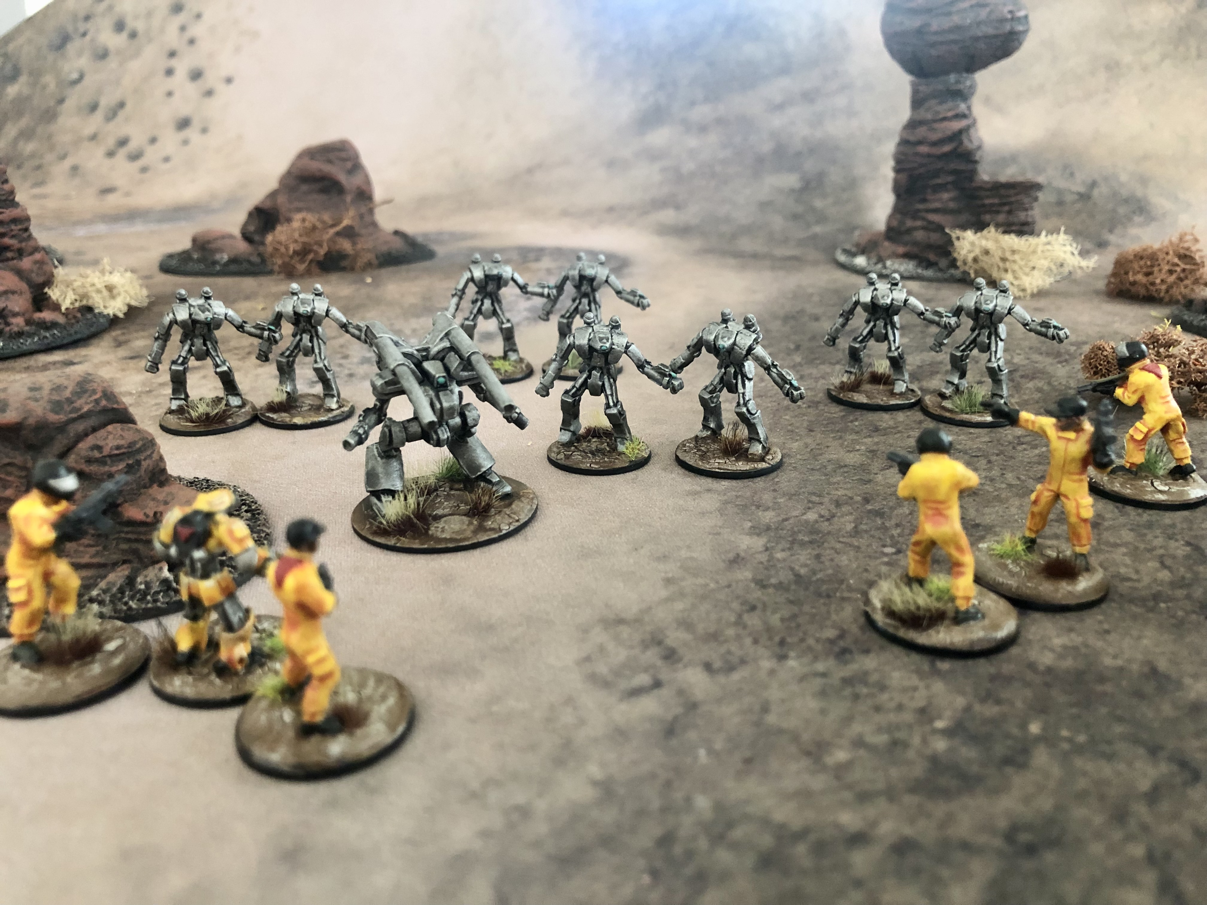 Next up is The Machine. Clearly, this is my Terminator knock-off. I had the eight Medium Xairbots (also from Reaper Bones) as sentry guns for Gaslands arena scenarios. In this case, I just added the one Large Xairbot to serve as the Avatar and the only Elite Infantry unit in my game. Maybe this group came to earth on the hunt for the greys who will be featured in a future post.
