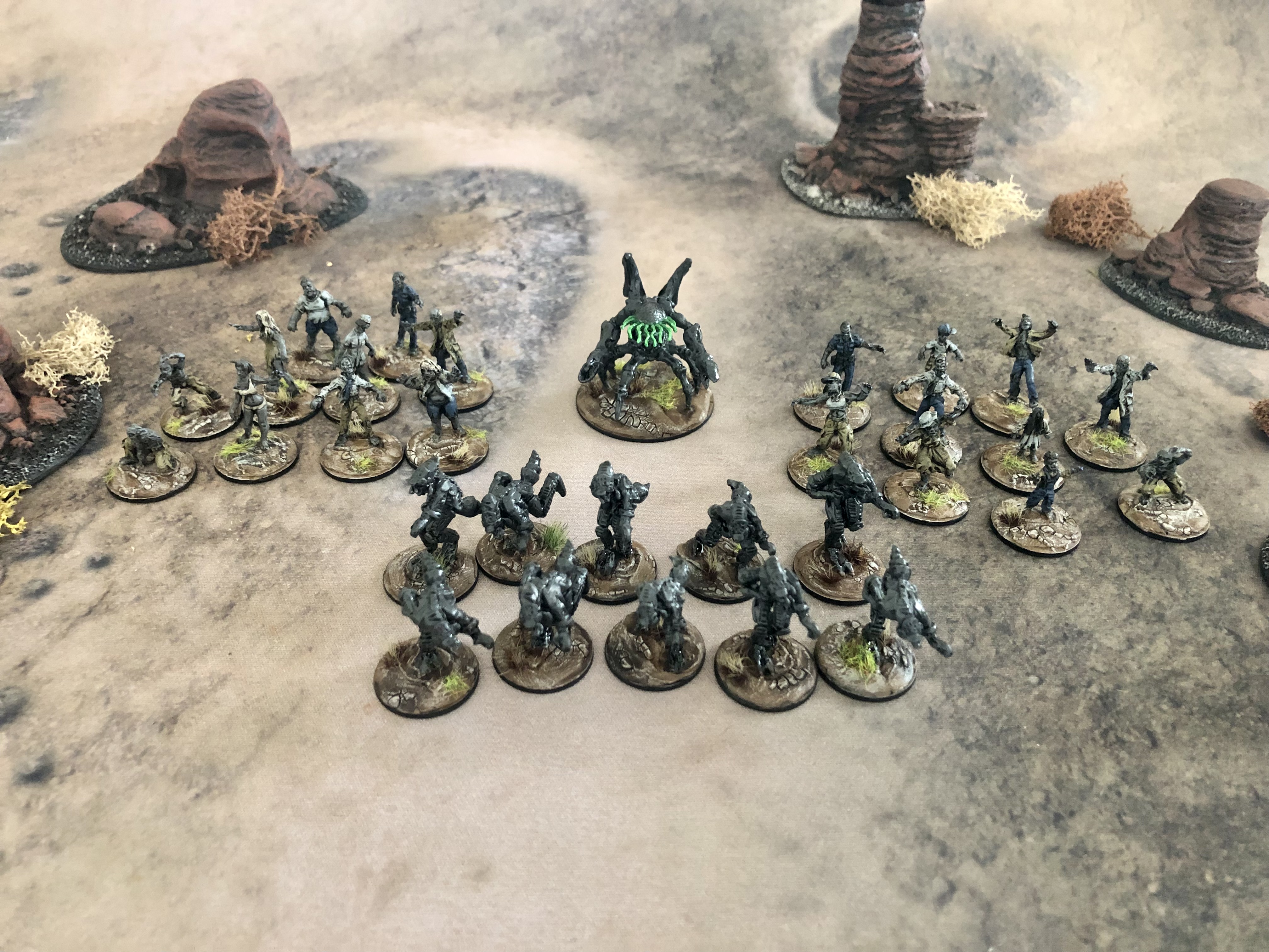 Third we have The Dead. This one is a blend of the Aliens and Zombie films, but here I’m having the zombies controlled hosts of the xenomorph. Perhaps the “queen” controls them as their bodies serve as incubators for xeno larvae. She’s a bit of a Cthulhu/Alien hybrid creature, but it was a model I had so thought it would work. Another Reaper Bones model, the Mi-go Eldritch Horror. In front of her is a unit of Elhiem Hive Hornets. She’s flanked by 20 plastic 1/72 zombies from Dark Alliance. Perhaps this lady found her way to earth as escaped cargo in a downed UFO? I already had the zombies for the Undead Gaslands scenario as well as the Hornets painted, so I just needed to put paint that Mi-go.