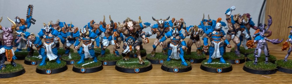 The beastmen painted relatively quickly due to them having little in the way of clothing.  The beastmen have a limited amount of hair which I started painting ‘normal’ colors until I had used them all up.  After that I switched to some garish colors as I figured a Slaanesh worshiping team would be all about being seen.  One enjoyable moment was when of the models fell off my holding paint pot and fell directly into my open wet pallet.  This was my first-time painting metal models and the weight of them was too much for my poster tack.  Thankfully, the model only got paint on its shoulder pads instead of the airbrushed skin.  The variety on this team is awesome.  Even with duplicated bodies there is enough head variety to make the team unique.  Speaking of heads, this team has a great variety of horns if you are into that kind of thing.  Here they all are finished up: